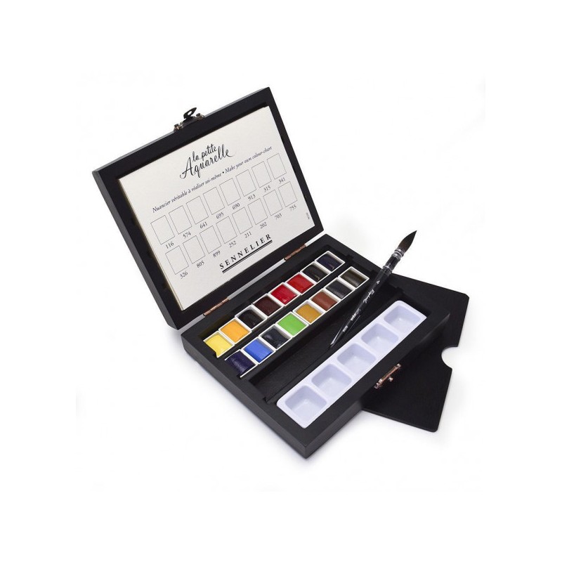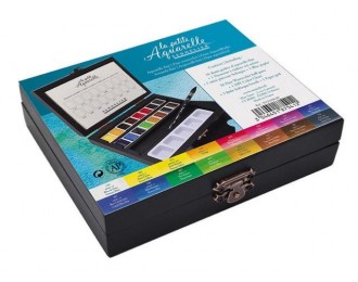 Magifique coffret en bois de 16 demi-godets "la Petite aquarelle" de Sennelier accompagnés d'un mini pinceau, un bloc papier, un nuancier à réaliser soi même et des accessoires.
