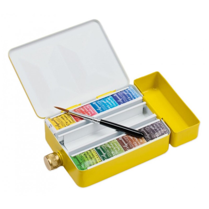 Idéale pour les artistes en déplacement, cette boîte en métal émaillé Sennelier combine praticité et raffinement. Grâce à sa réserve d’eau intégrée, ses 8 demi-godets d’aquarelle extra-fine et son pinceau inclus, elle offre un kit complet pour peindre en toute liberté, où que vous soyez.