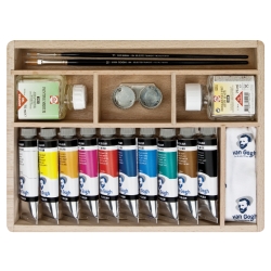 Huile fine haut de gamme reconnue pour sa texture délicate et onctueuse. La palette Van Gogh offre une large diversité de couleurs pures et brillantes pour obtenir des mélanges éclatants. L'huile Van Gogh se prète à toutes les techniques et se mélange parfaitement à tous les médiums pour un rendu inégalable. Elle sèche uniformément et ne craquèle pas, pour une superposition parfaite des couleurs. Elle offre aussi une grande tenue des teintes et une grande résistance à la lumière dans le temps. La finesse des pigments donne la possibilité à l'artiste de travailler la pâte en glacis tout en conservant l'éclat des couleurs.